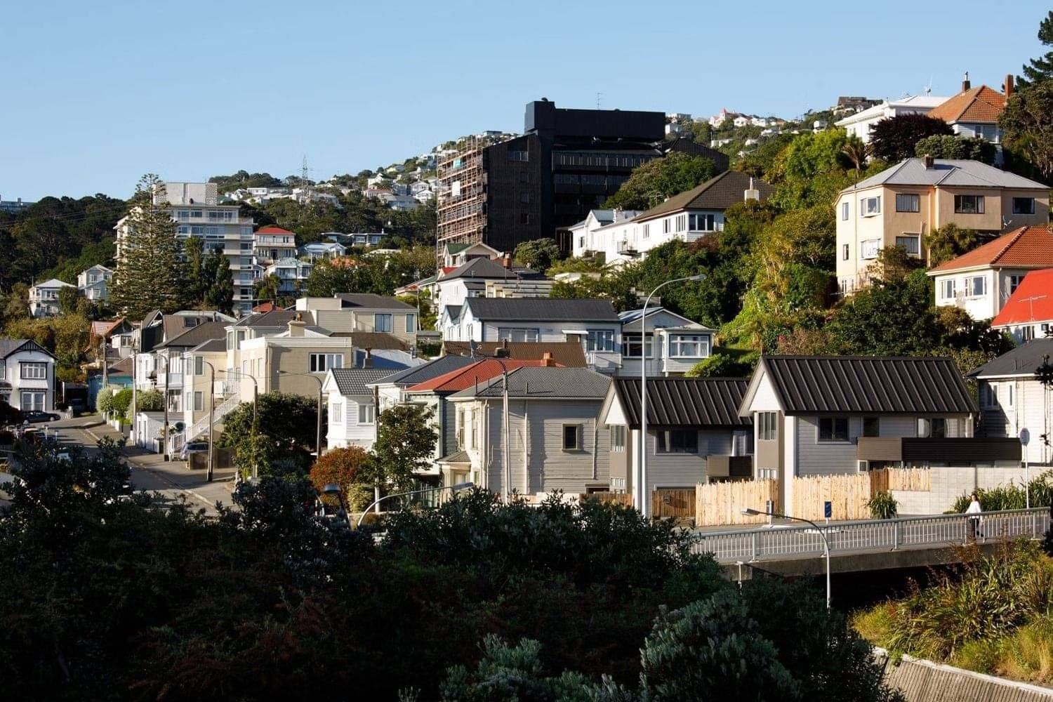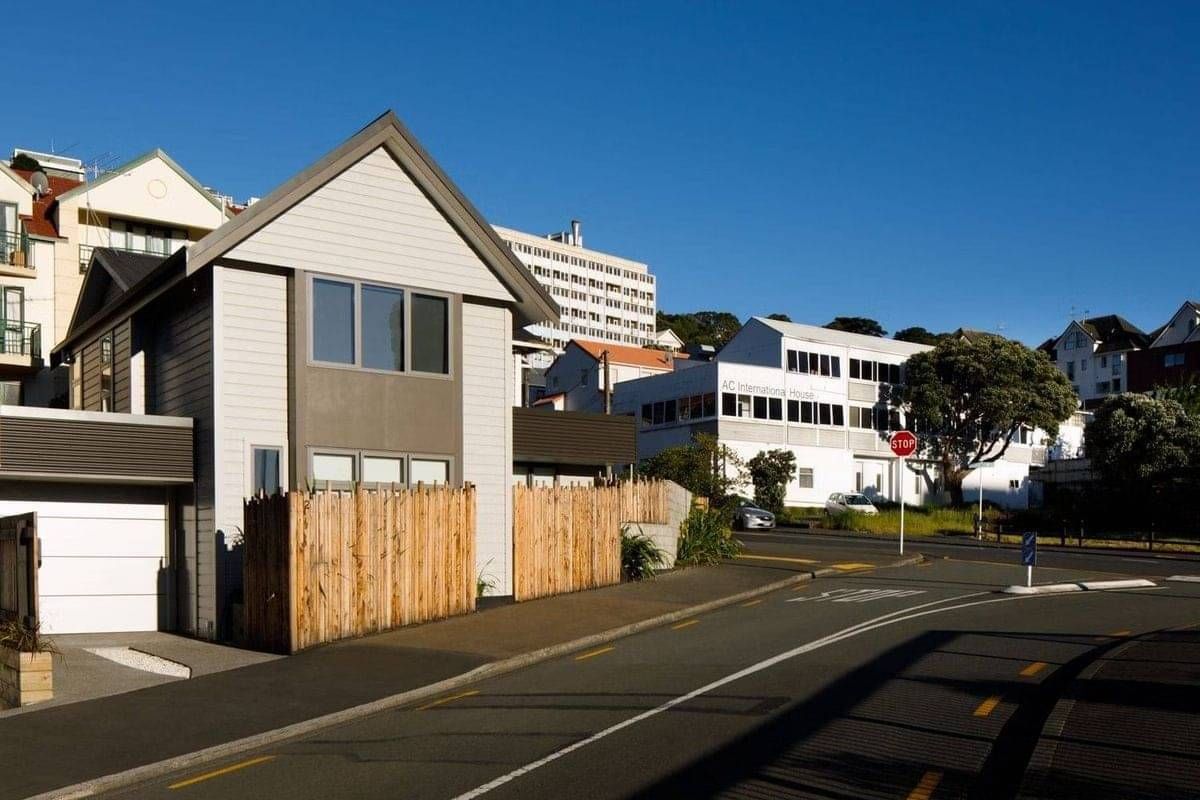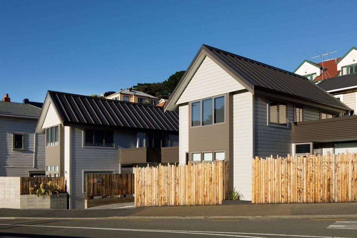 This pair of houses in central Wellington occupy a 292m2 triangular site leftover from motorway development in the 1980s.