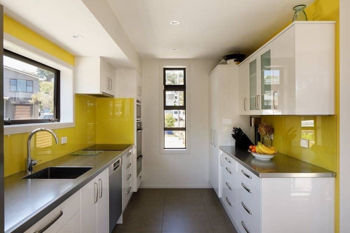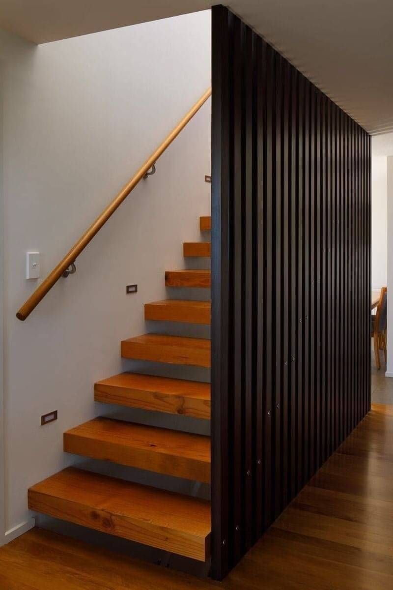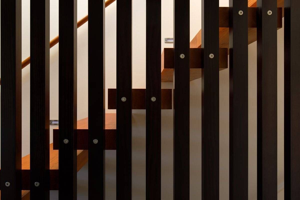 The floating stair treads are recycled from Oregon beams rescued from a Whanganui warehouse by Aonui Architecture. The open risers allow views of the water and island from the breakfast bar.