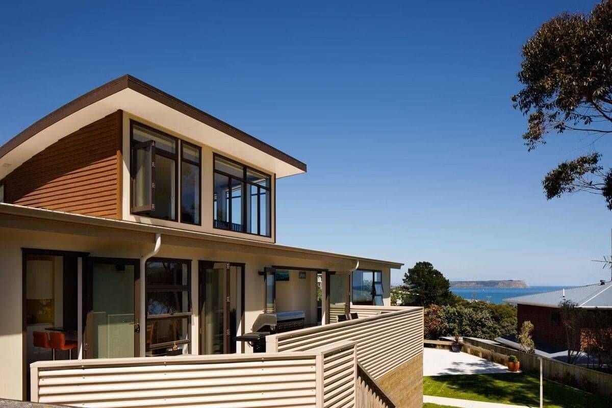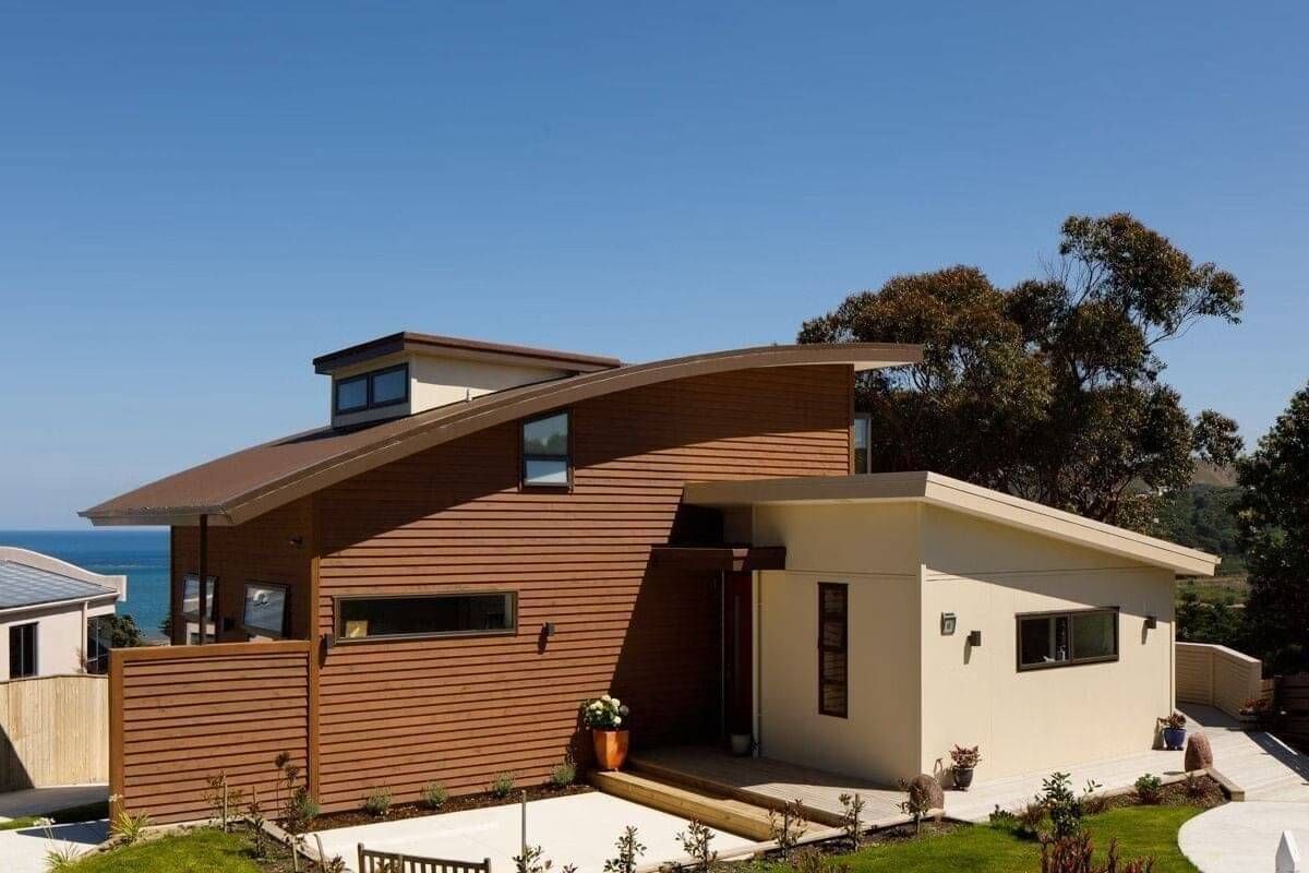 This hillside home is obliquely angled on the site for axial views across the water to Mana Island and towards the hills of Plimmerton and Pukerua Bay. The design of the curved roof is aerodynamic, to largely eliminate wind noise, as well as being a popular move to help preserve the fantastic panorama for the neighbours.