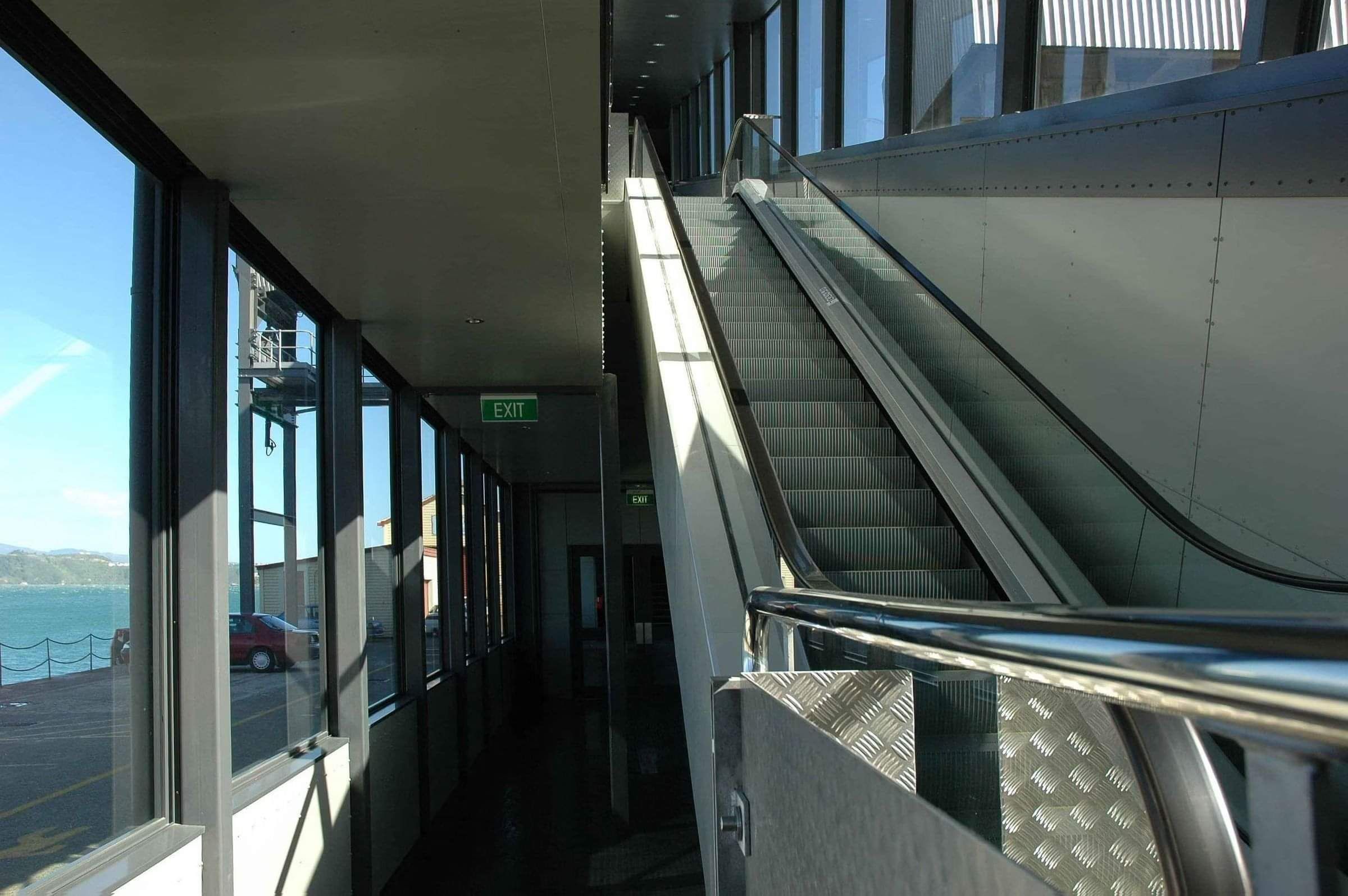 This link from land to sea is clad in long run corrugate, with view shafts across the harbour out through the glazed panels.