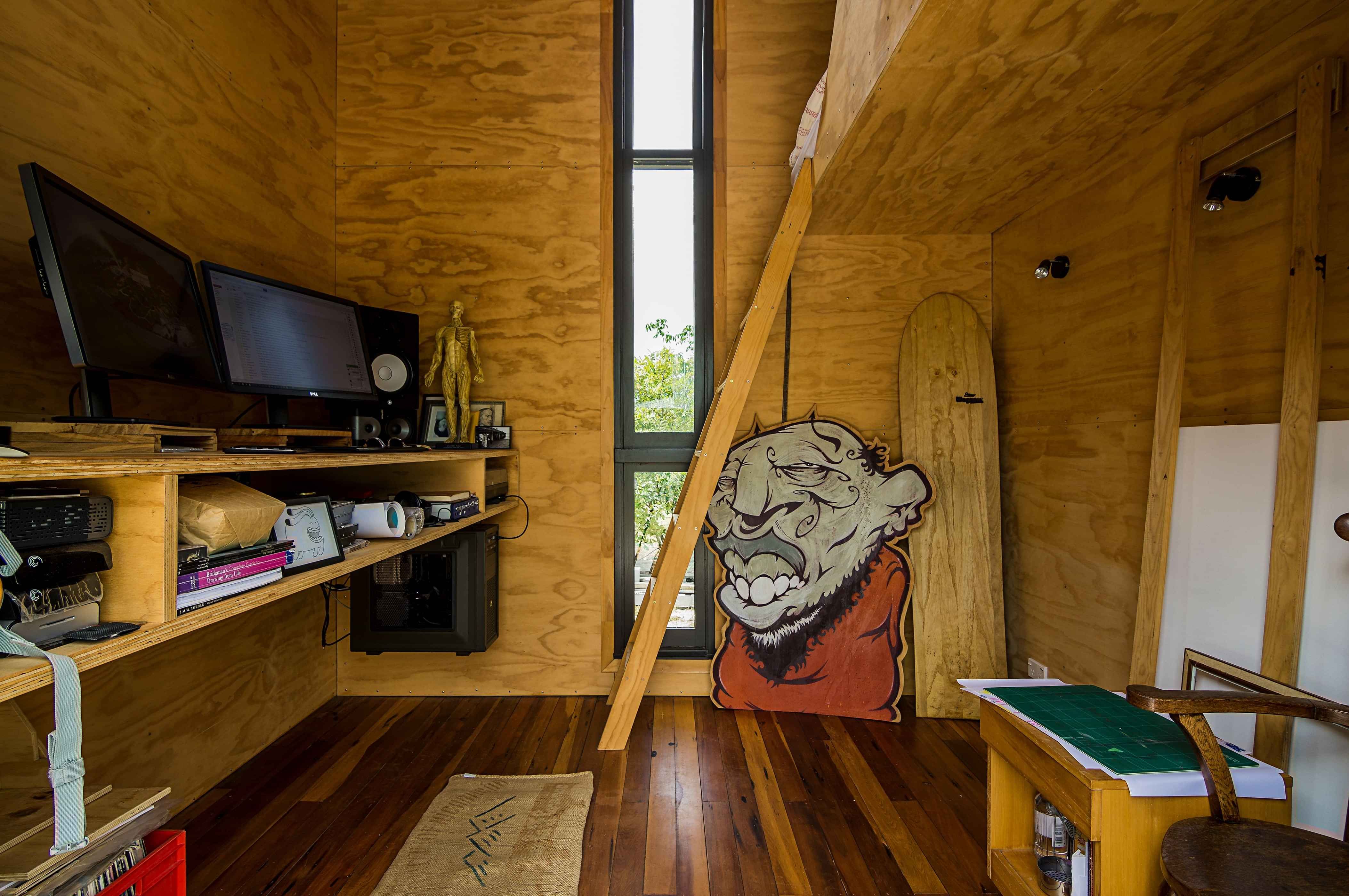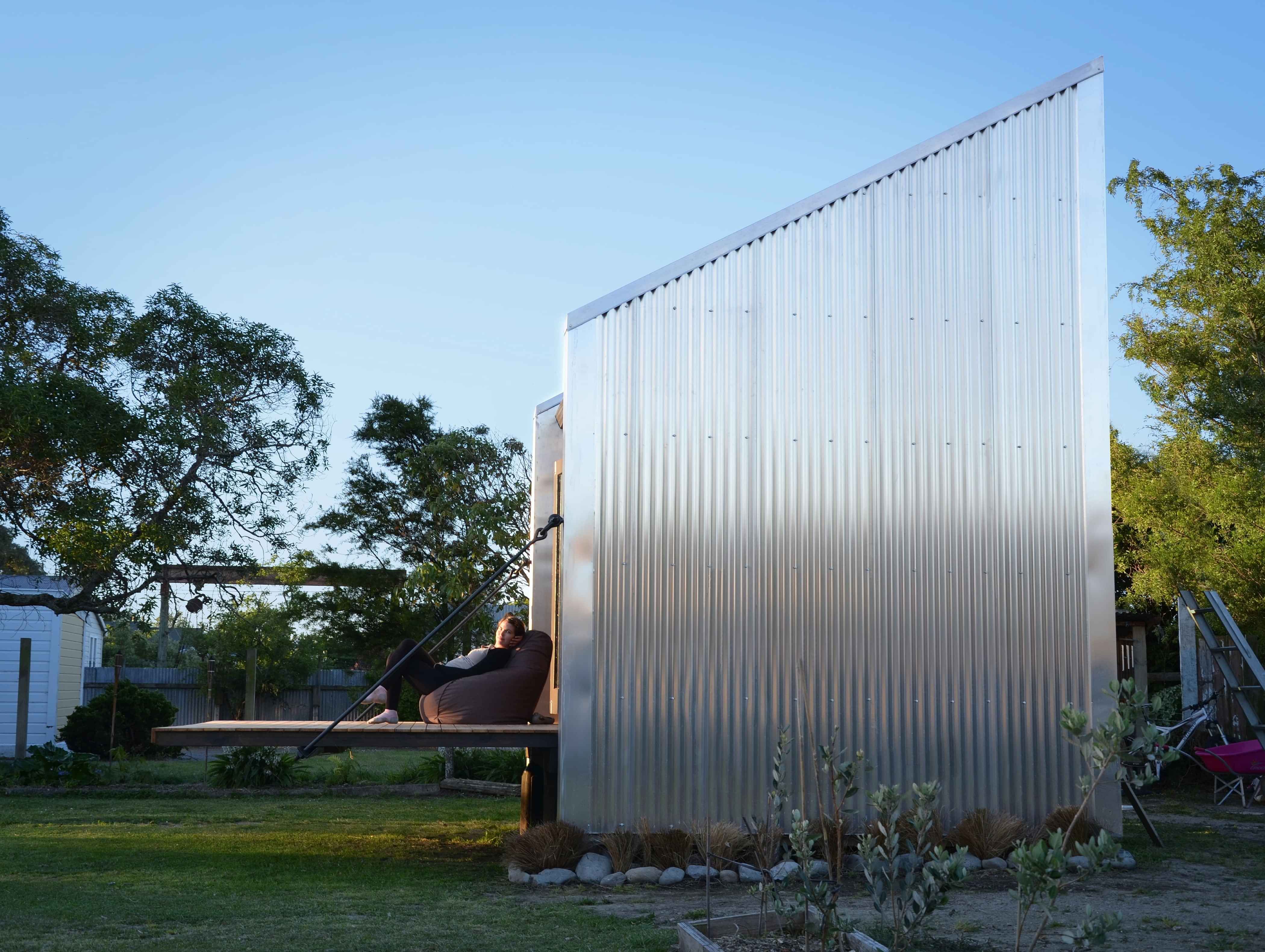 This 10 m2 prefabricated rear garden studio in central Martinborough is built partly from recycled and surplus materials. The space provides a work studio for our client, a designer, and also doubles as a spare room for visitors, with a mezzanine bed.