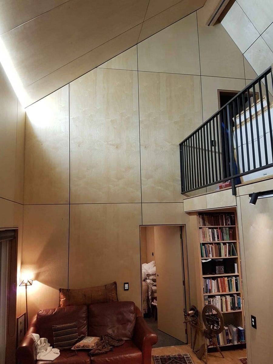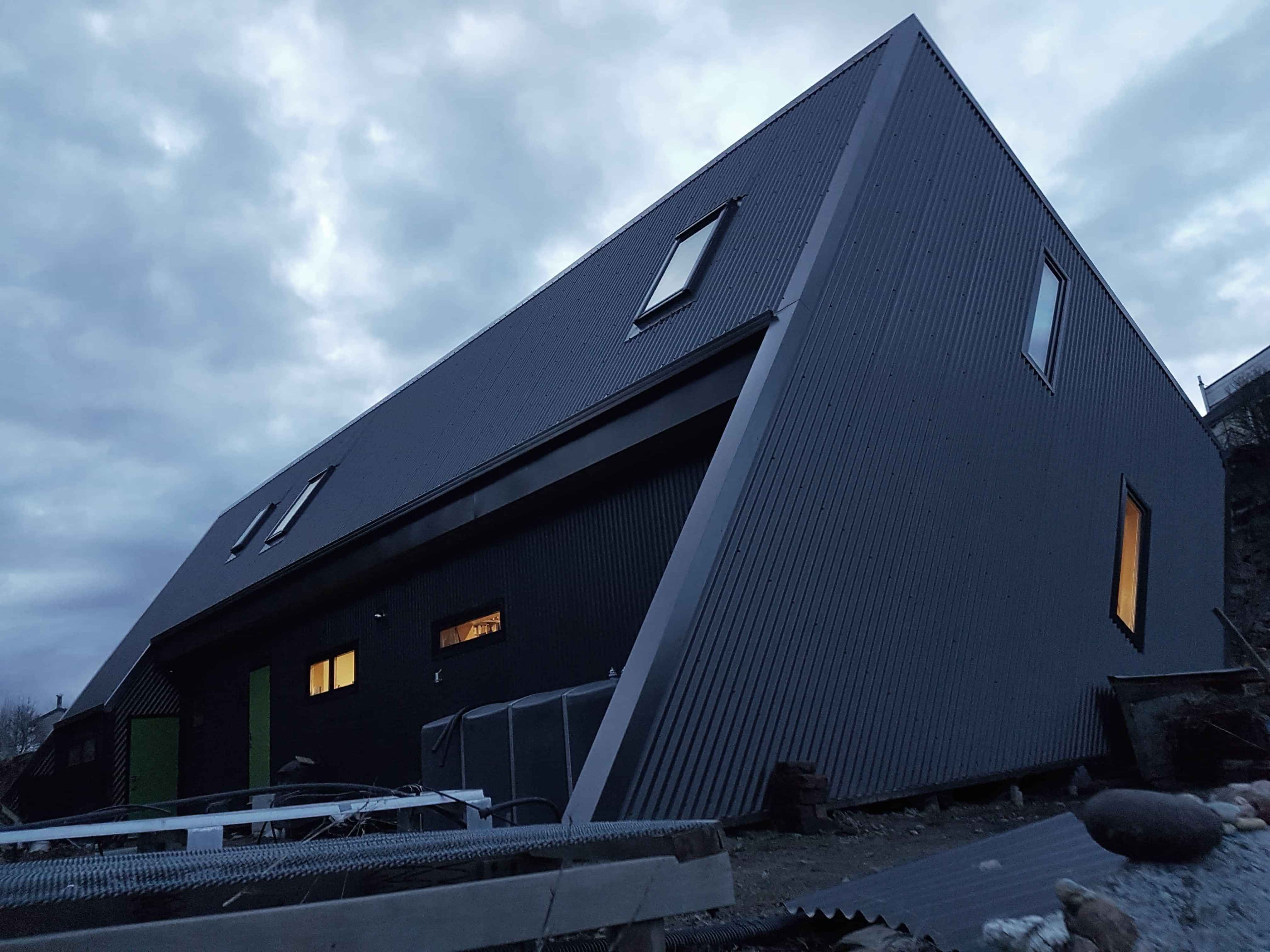 High levels of insulation were achieved using SIPS panel construction to ensure thermal performance. The roof is angled at 32° towards north to maximise solar panel efficiency with the aim for a net positive annual power generation. The ever-present and common risk of summer overheating in passive solar houses is avoided by strategically placed high-level south wall windows that expedite warm air expulsion by stack ventilation.