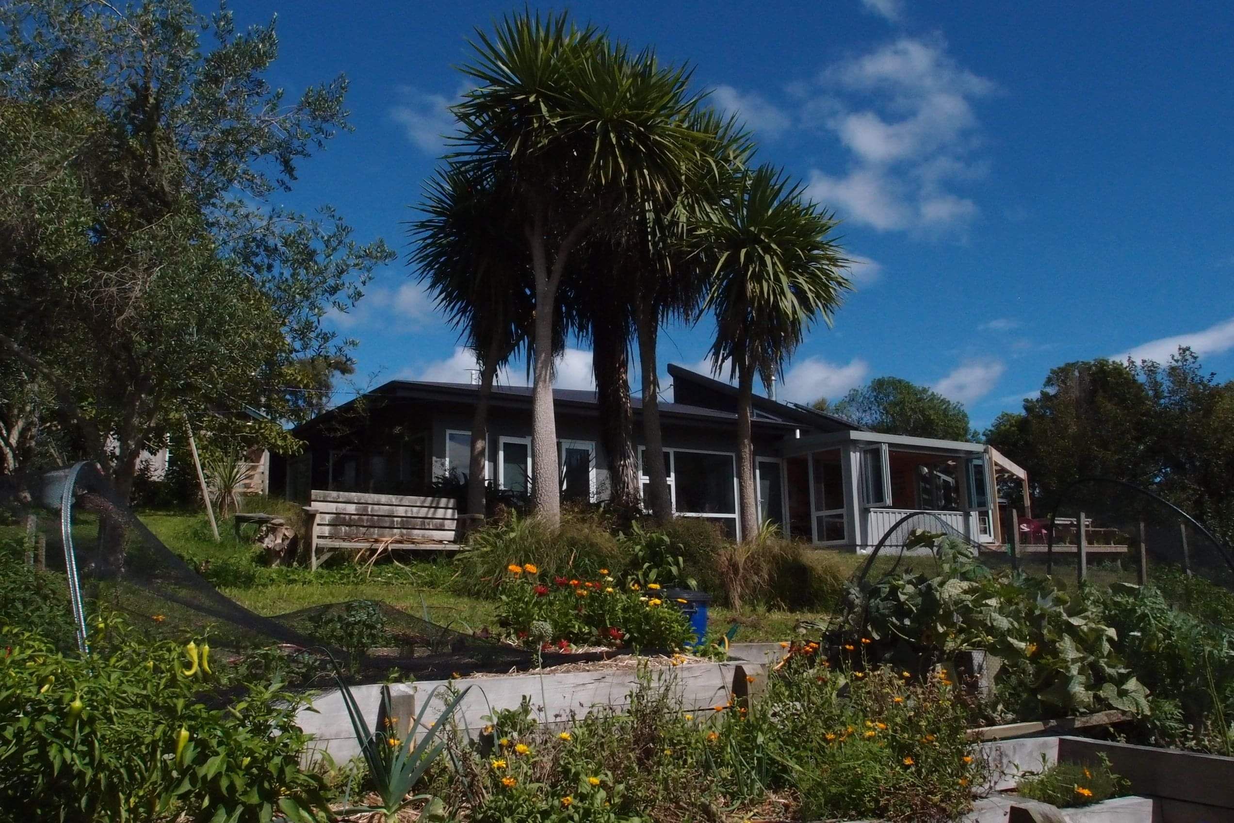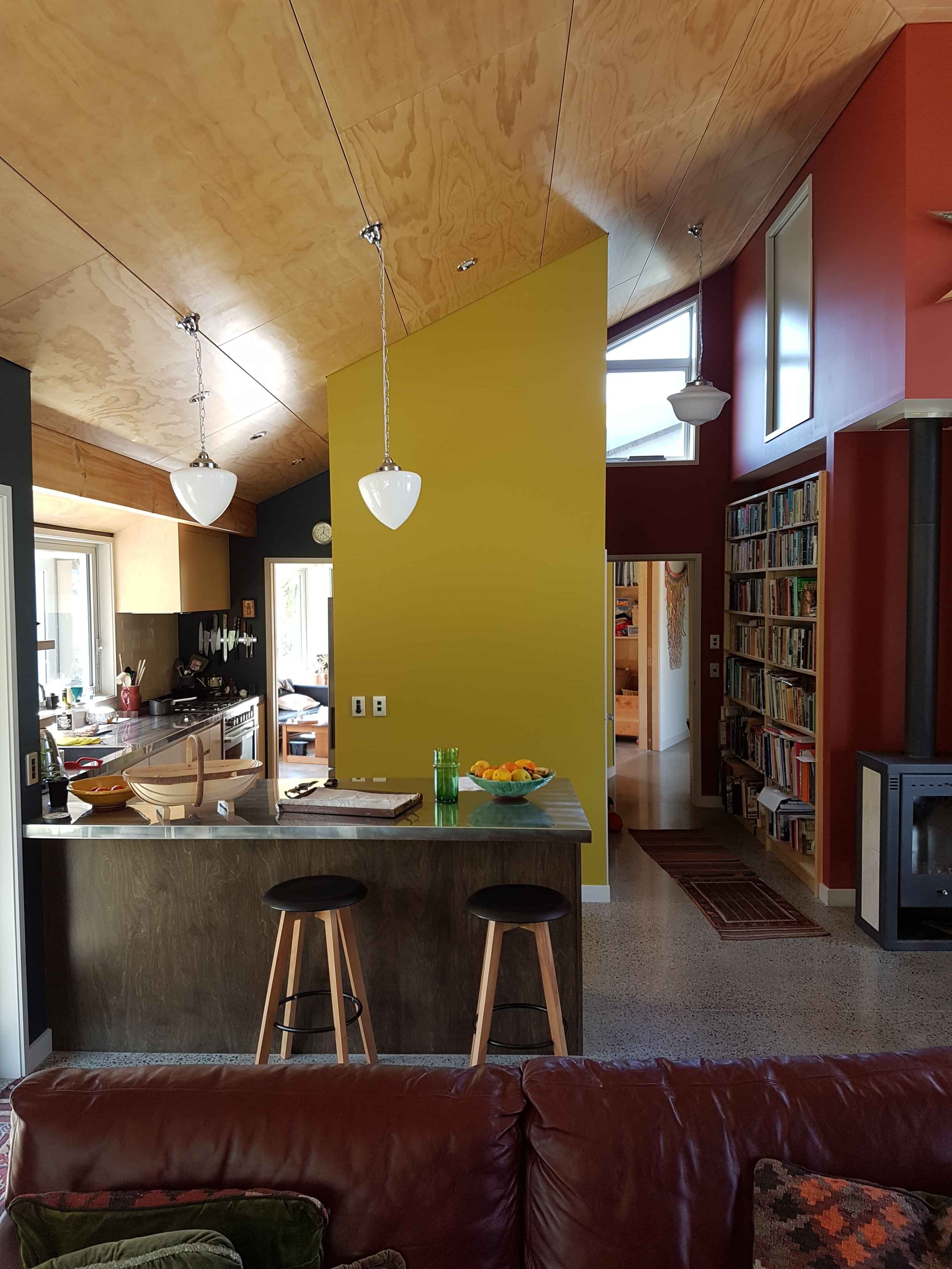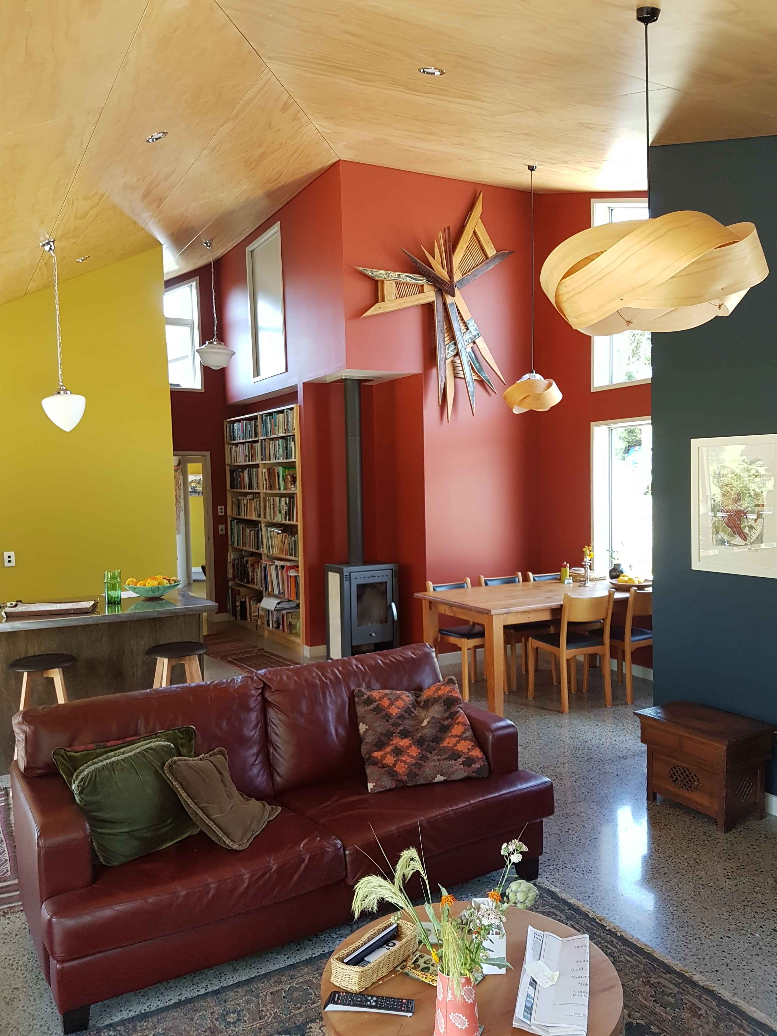 This double winged home is nestled into the landscape and beautifully integrated with the surrounding natural environment. The colourful interior walls provide a striking contrast with the natural palatte of the high ceiling.